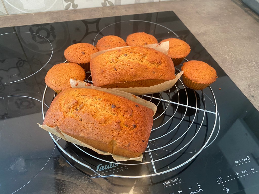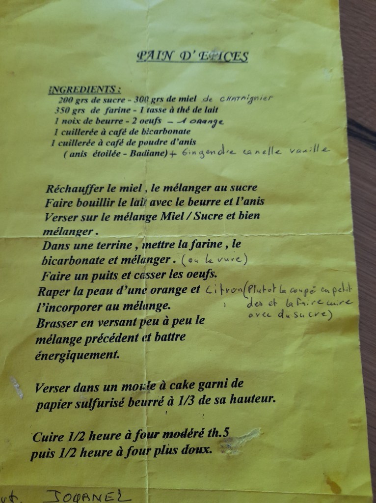 ingrédients : 320 g de farine – 320 g de miel (châtaignier de Valencogne) – 140 g de lait – 120 g de beurre – 1 sachet de levure – 2 cuillères à café bombées d’épices à pain d’épices, 2 cuillères à soupe d’orange confites trempées dans du rhum et égouttées, 2 casoupe de cerneaux de noix émiettés, 2 cas de mini pépites de chocolat noir (vrac à biocoop)