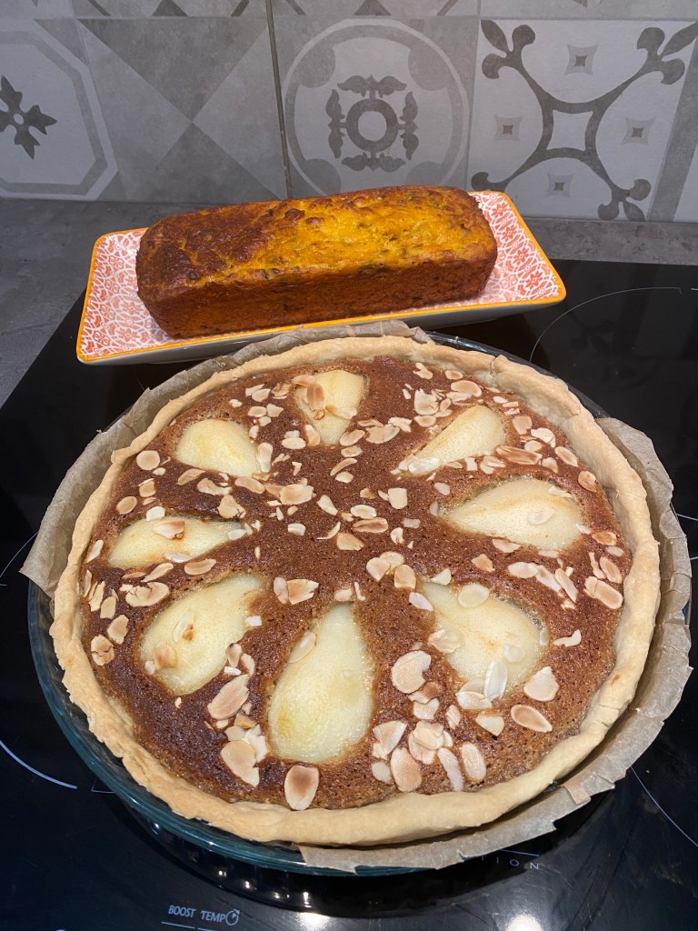 Étaler la pâte, mélanger dans un saladier tous les ingrédients sauf les poires et amandes effilées . Étaler sur le fond de tarte. Disposer les poires en quartier ou tranches et parsemer les amandes effilées sur le dessus.