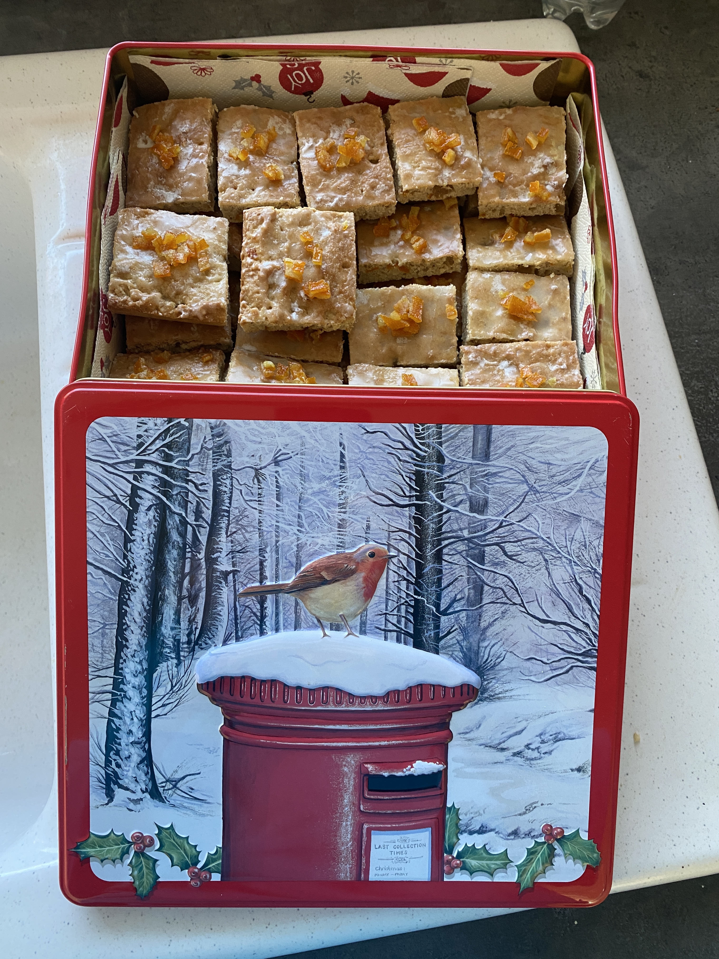 Pour la pâte : 250 g de farine, 2 c. à café rases de levure chimique, 75 g de sucre, 1 sachet de sucre vanillé, 1 œuf, 100 g de beurre, 125 g de fromage blanc (type faisselle), Zestes râpés d’un demi-citron, 1 c. à café rase de quatre épices, 1 c. à café de rhum, 50 g de dés de citrons confits, 100 g de raisins secs mélangés (Corinthe, sultanines) ou de cranberries, 50 g d’amandes en poudre.